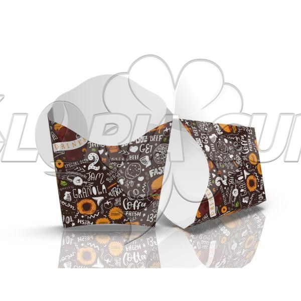 Наша упаковка для картоплі фрі виготовлена з вісококачественного харчового картону, який не пропускає жири і масло. Упаковка не впливає на смак картоплі, прекрасно зберігає тепло і виключає можливість обпектися, що важливо для дитячої аудиторії. Картонна упаковка для картоплі фрі чудово поводиться при транспортуванні і може грати роль одноразового посуду - тарілки і немає необхідності пересипати картоплю фрі в іншу ємність, досить покласти упаковку для картоплі на стіл.