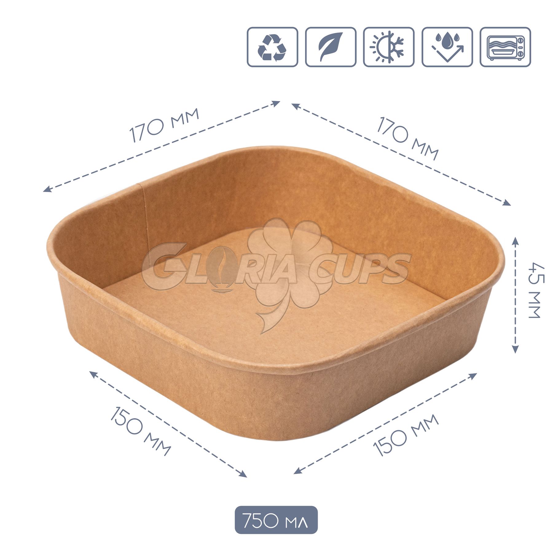 Контейнер паперовий для салату квадратний 750 мл 170*170*45 мм КРАФТ