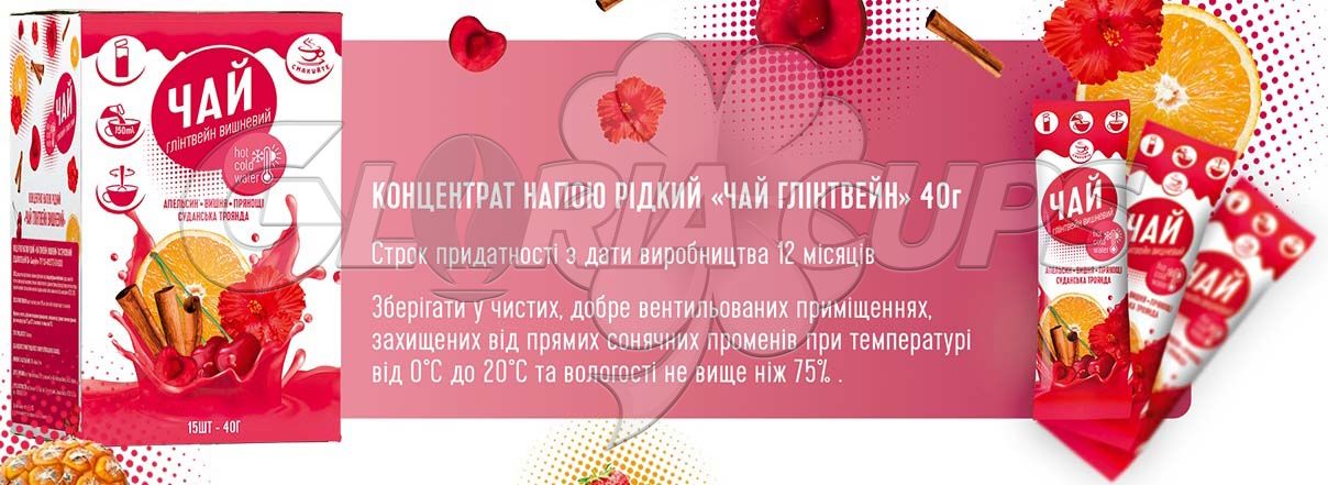 Концентрат чаю Смакуйте глінтвейн – це бленд свіжої замороженої вишні, меду, апельсина, каркаде, кориці, мускатного горіха, гвоздики, червоного меленого перцю, цукру.