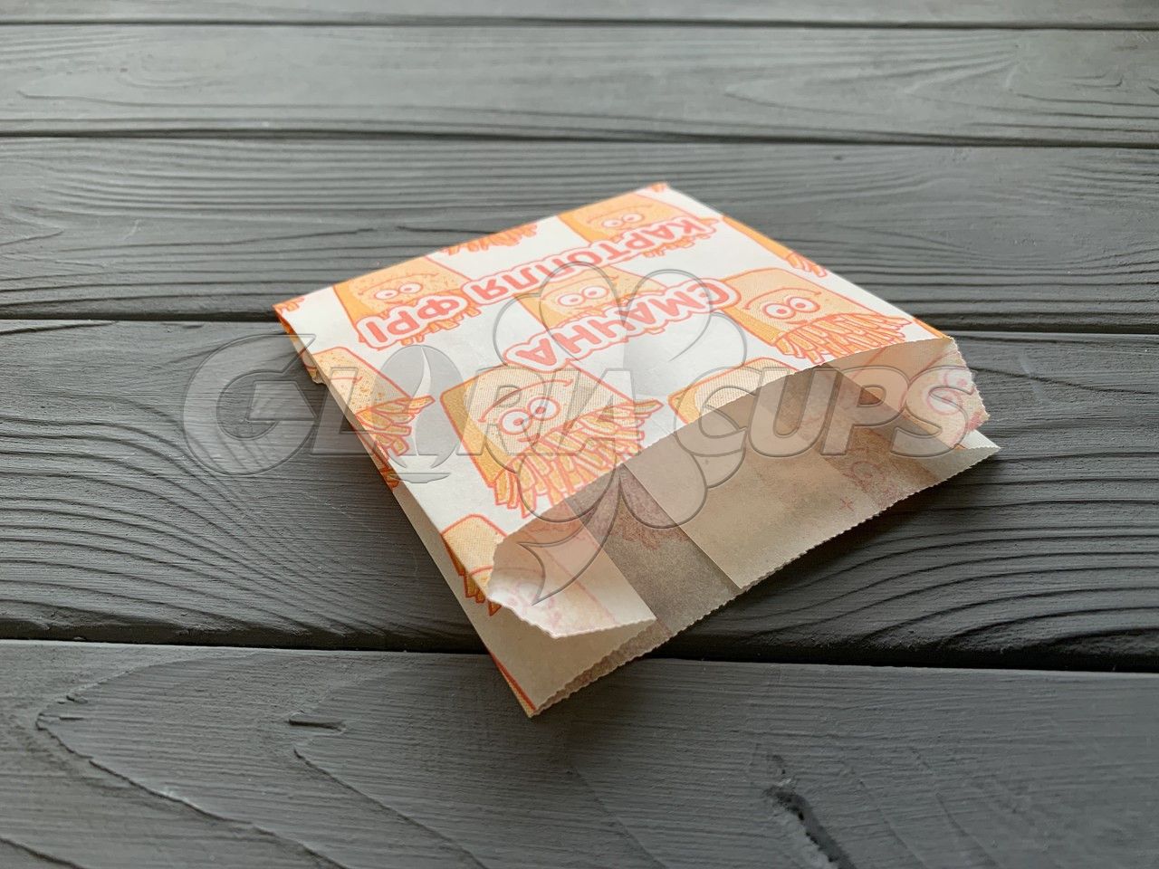 Упаковка для картоплі фрі зроблена з якісного жиростійкого еко-матеріалу. Його особливість - щільна і міцна структура, забезпечує практичність і надійність у використанні. Широко використовується у ресторанах швидкого харчування.